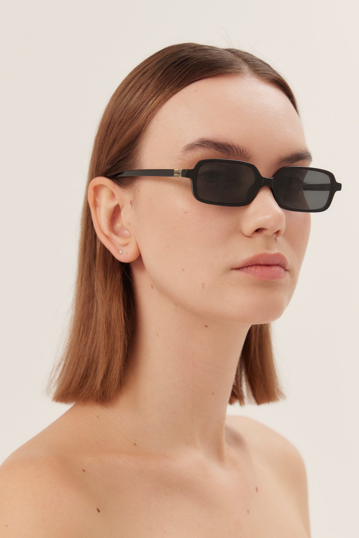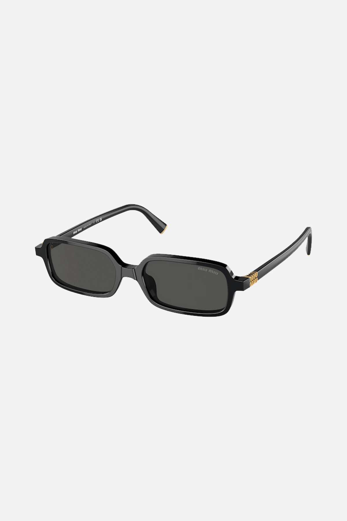 Acetate sunglasses with sophisticated, feminine allure. The oversized frame is emphasized by thin acetate rims that separate from the wide flat lenses before meeting up at new Miu Miu vertical logo integrated in the hinge of the straight temples.